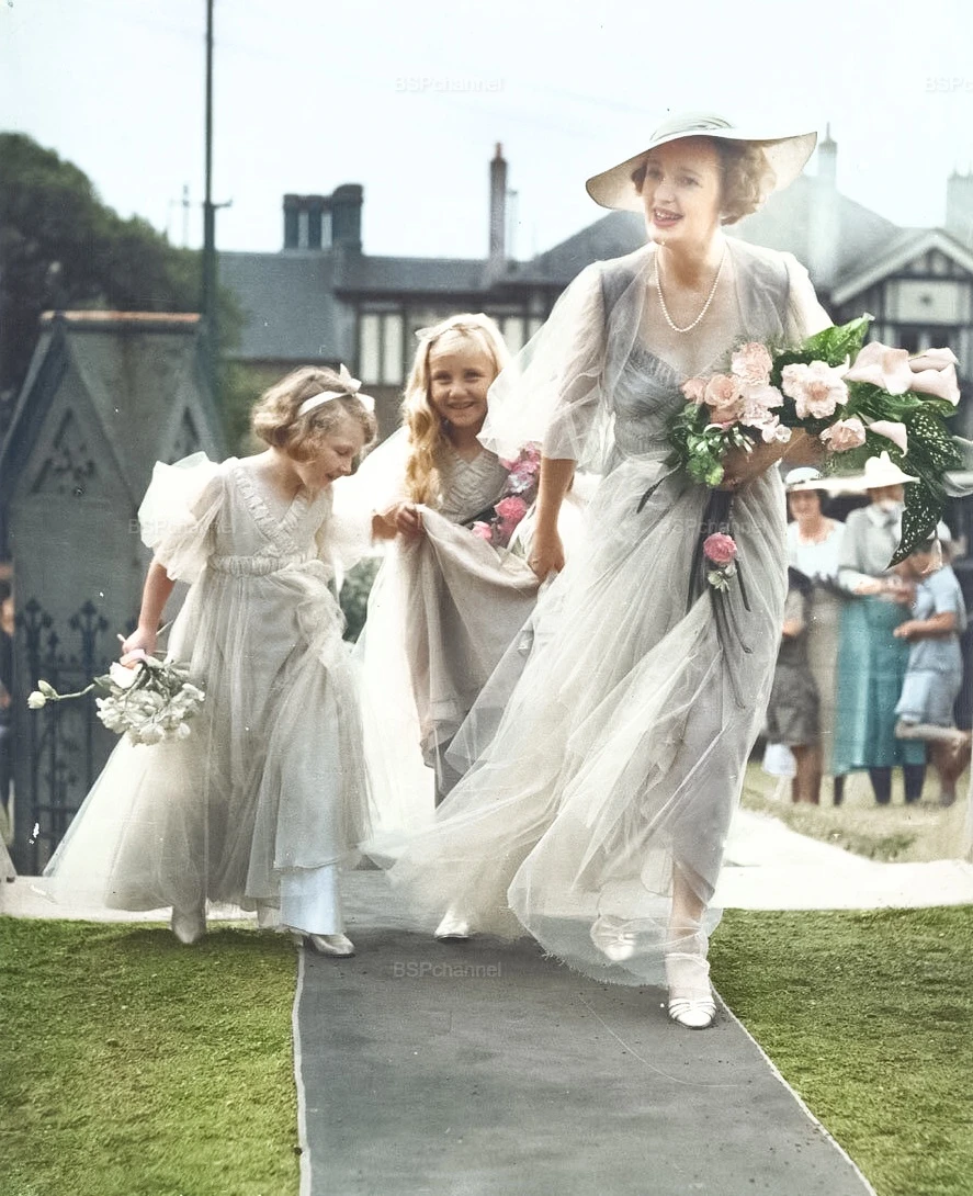 A bridesmaid and two girls carrying flowers enter St. Mark's Church. New South Wales, Australia, 1930s.