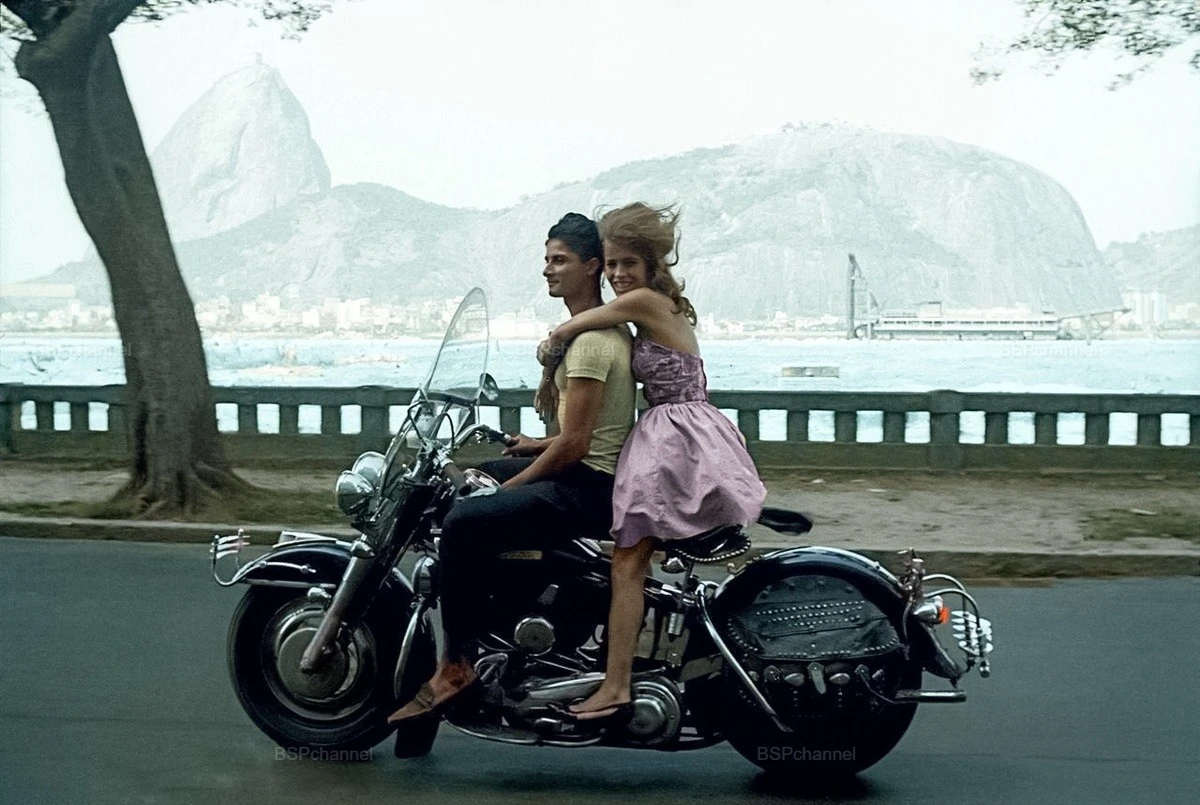A couple on a motorcycle. Rio de Janeiro, Brazil, 1963.