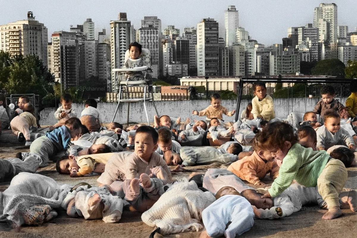 This photo shows children abandoned by their parents playing on the flat roof of the FEBEM center in the Pacaembu district of São Paulo. The facility houses 430 children: 35% were found abandoned on the city streets, while the rest were deliberately abandoned by their parents, unable or unwilling to care for them.