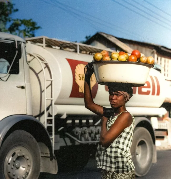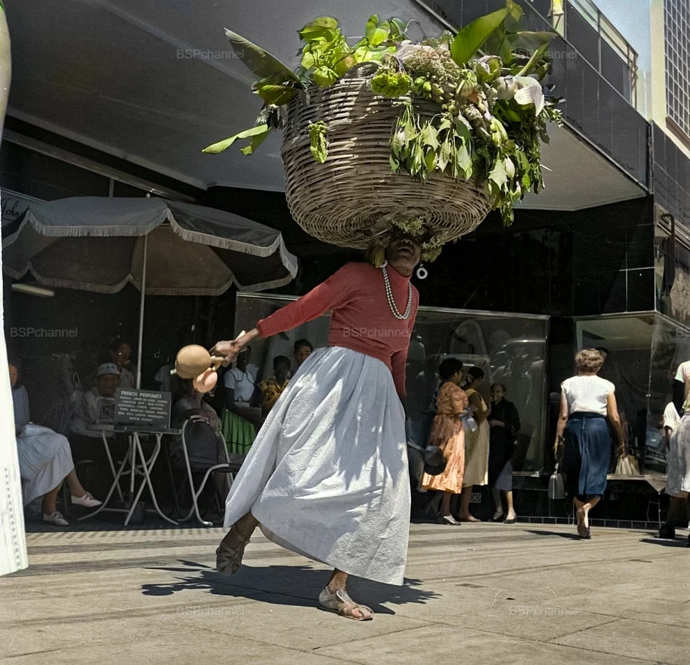 This method of carrying loads, combining practicality and grace, was common in the Caribbean and reflected both local traditions and the cultural heritage of the African and Indian communities that inhabited the island. Port of Spain in the mid-20th century was a city where the colonial past, tropical everyday life, and the growing desire for independence (Trinidad would achieve it in 1962) intertwined.