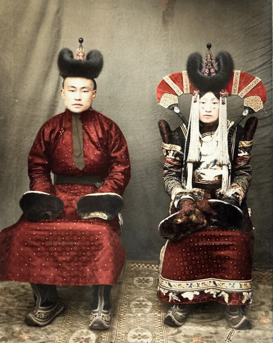 A married couple in traditional Mongolian costume. Mongolia, 1920s.