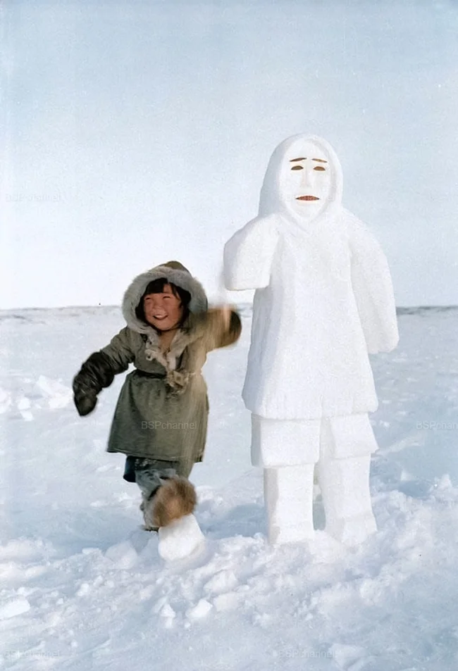 Theresia, a three-year-old daughter of a Pelli Bay Indian, stands next to a snowman carved by her father, 1951.