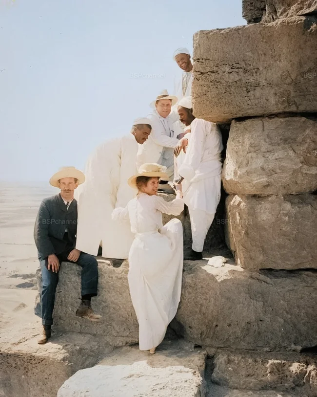 Tourists at the Giza Pyramids. Egypt, early 20th century.
