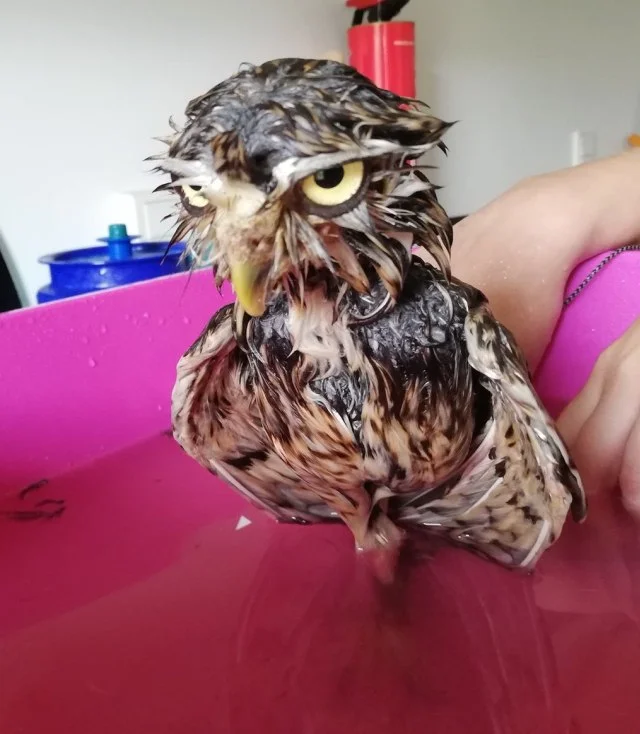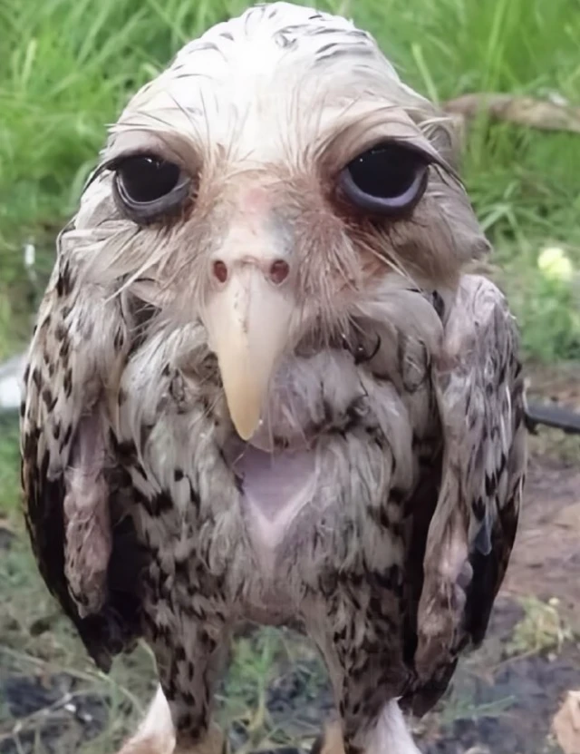 This is what an owl looks like after a heavy rain: its feathers retain water well, becoming heavy, making it difficult for the bird to take to the air—it tires quickly.