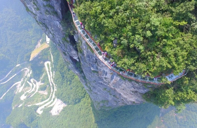 At an altitude of 1,430 meters, a glass walkway, 60 meters long and less than a meter wide, winds along the sheer cliff face of Tianmen Mountain (the "Gate of Heaven"). Beneath the feet of the brave is only transparent glass, and below lies a chasm. This is one of the most extreme observation platforms in the world, requiring remarkable courage. To protect the fragile surface, visitors wear shoe covers. Due to the danger, glass maintenance and cleaning are among the highest-paid and riskiest jobs here.
