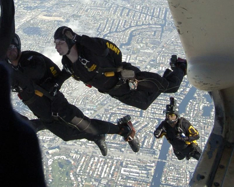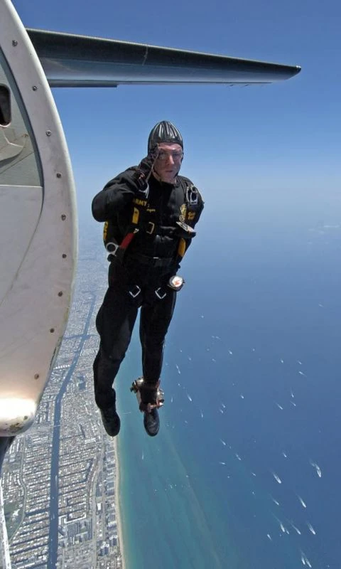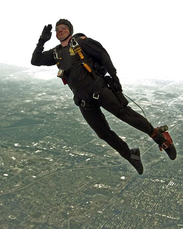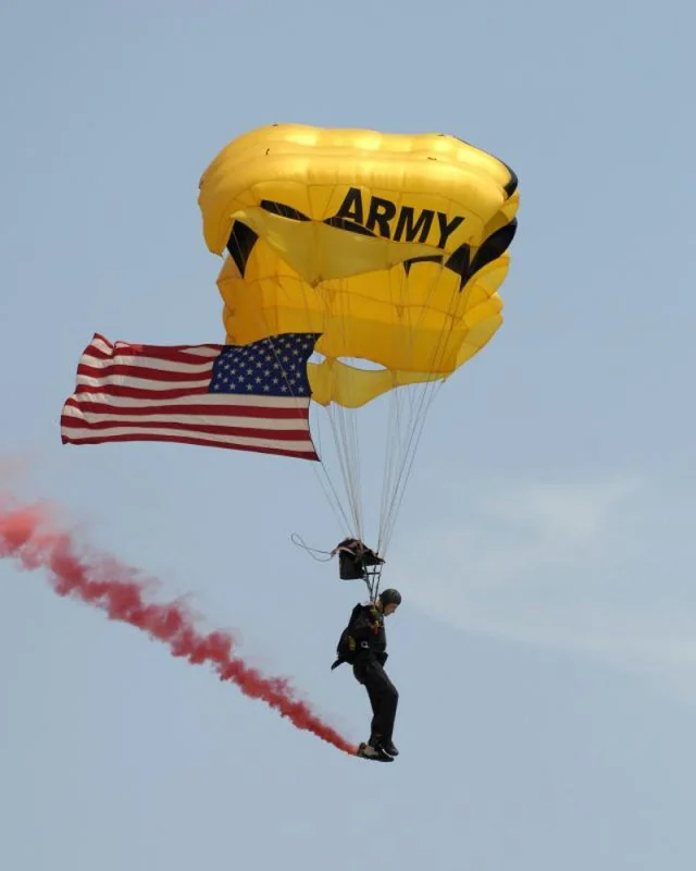 11. A soldier with the Golden Knights Airborne salutes after jumping from an airplane over Fort Lauderdale, Florida, during a McDonald's demonstration May 7, 2006. (UPI Photo/Joe Marino-Bill Cantrell
