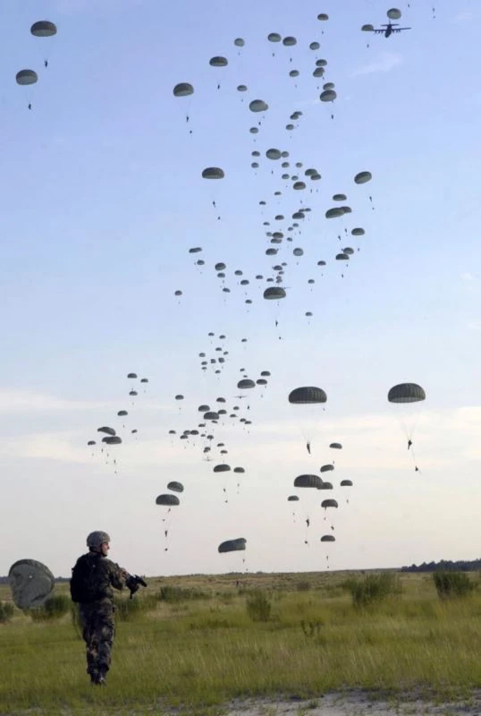 4. U.S. Senior Airman Corey Boatwright records the landing of 82nd Airborne Division soldiers after jumping from a C-17 Golbemaster III during a training airborne assault at Fort Bragg, North Carolina, June 17, 2008. (UPI Photo/Rasheen A. Douglas/U.S. Air Force)