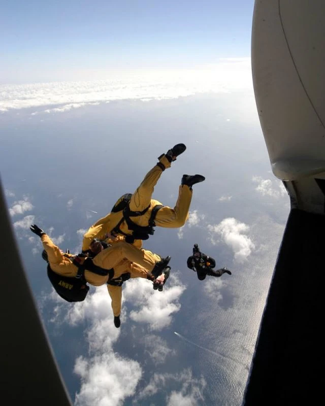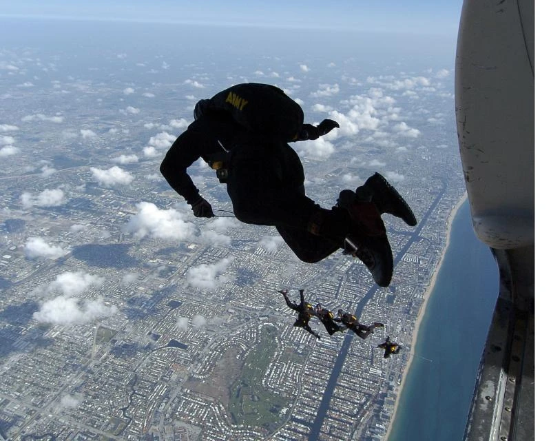 3. Members of the Golden Knights skydiving team jump from an airplane over Fort Lauderdale, Florida, during the McDonald's Air and Sea Show on May 7, 2006. (UPI Photo/Joe Marino-Bill Cantrell)