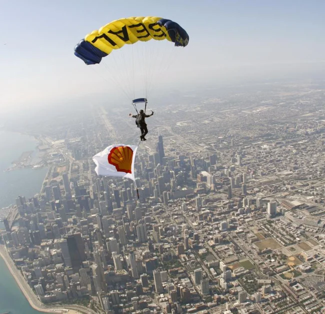 10. Chief Petty Officer Justin Gowney of the U.S. Navy's Airborne Assault Team parachutes over Chicago during a training jump at the 51st annual Chicago Air Show on August 14, 2009. (UPI/J.C. Ledbetter/U.S. Navy)