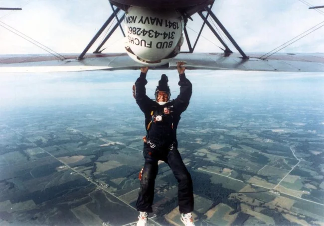 13. Senior skydiver and adventure enthusiast Howard Burling, 65, of Bristol, Connecticut, Hangs from a biplane on September 24, 1999. ((PRNewsFoto) cc/ho UPI)