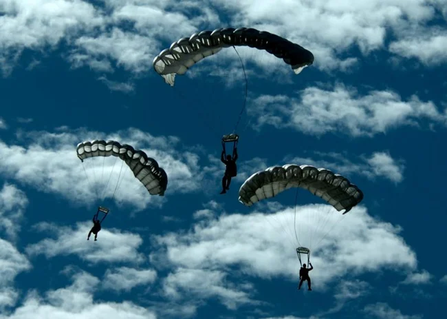 12. A squad of Army Rangers parachute out of a C-17 Globemaster III during the 2009 Ranger Rendezvous over Fort Benning, Georgia, on August 3, 2009. More than 1,000 paratroopers from across the country participated in the mass tactical jump. (UPI/Jason Epley/U.S. Air Force)