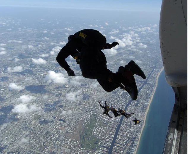 8. A U.S. soldier jumps out of a C-130E Hercules aircraft over southern Germany on April 30, 2009, during the Combat Readiness Group's 10th anniversary celebration. (UPI Photo/Grovert Fuentes-Contreras/USAF)