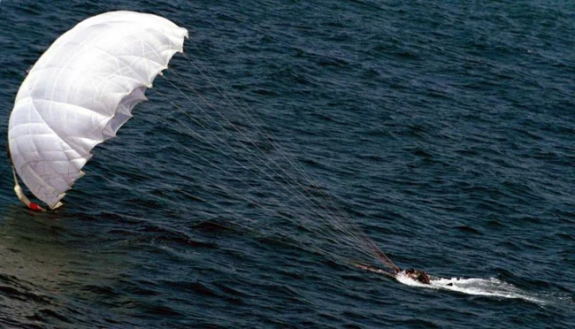 23. Ukrainian Secret Service officers practice parachute jumps into the sea on June 14, 2000, in Sevastopol as part of an anti-terrorism program. With such training, they will easily find work in Odessa after their service. (mc/Sergei Svetlitsky/UPI)