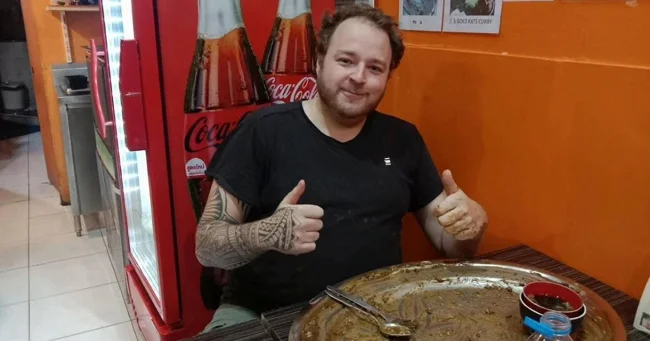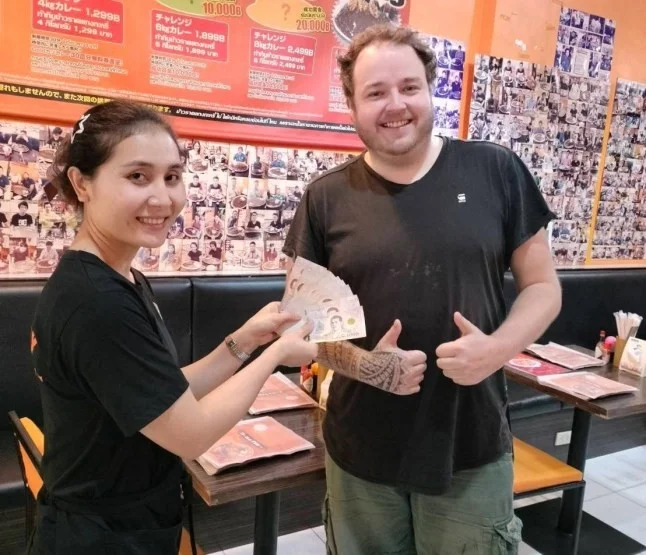 A chef was caught cheating at a curry-eating contest at the Thai restaurant Gold Curry. Sebastian Schwesinger, 37, attempted to conquer a 10-kilogram portion for 20,000 baht. However, CCTV captured the tourist from Leipzig, Germany, hiding some of the food in his backpack.