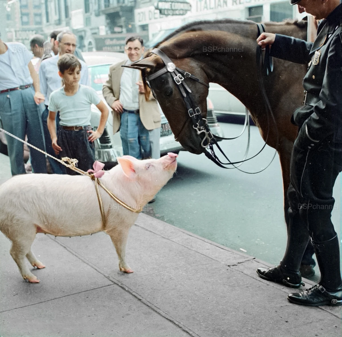 A pig examines a police horse in New York, 1956.