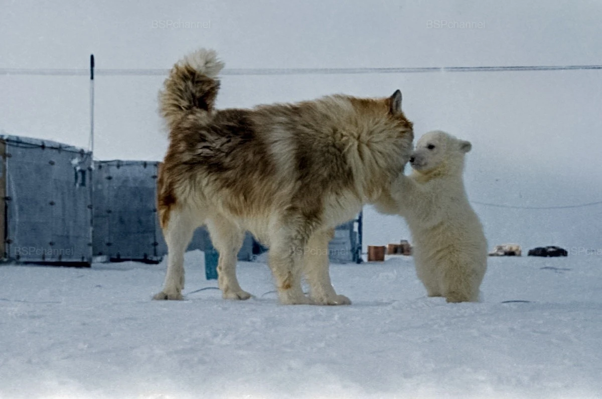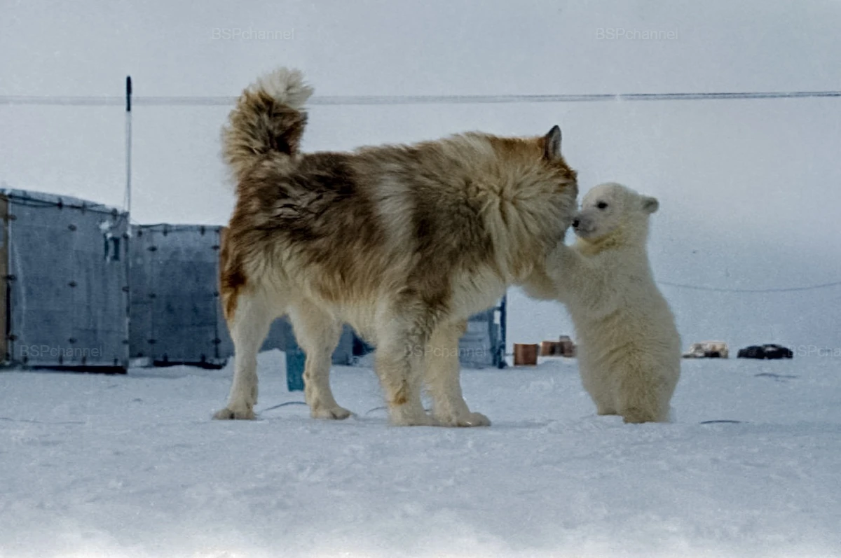 A husky dog and a polar bear cub at a polar explorers' camp, 1972.