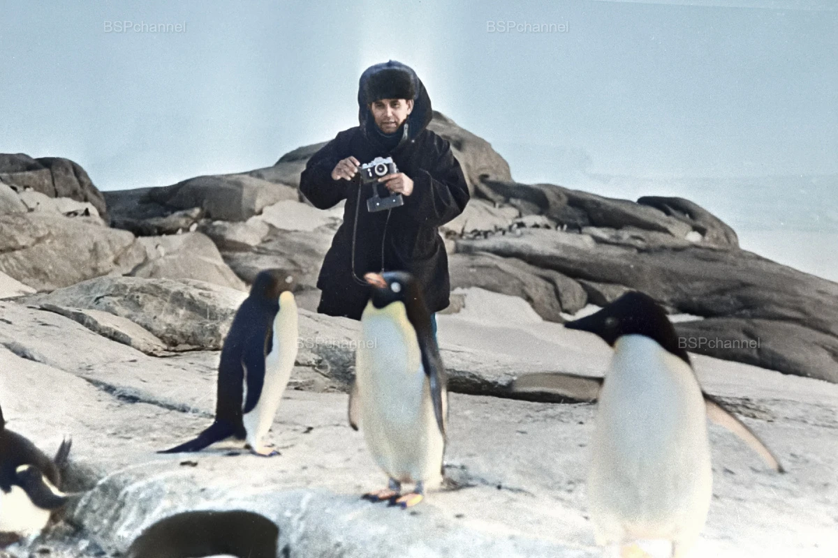 Journalist Vasily Peskov photographs penguins in Antarctica, 1975.