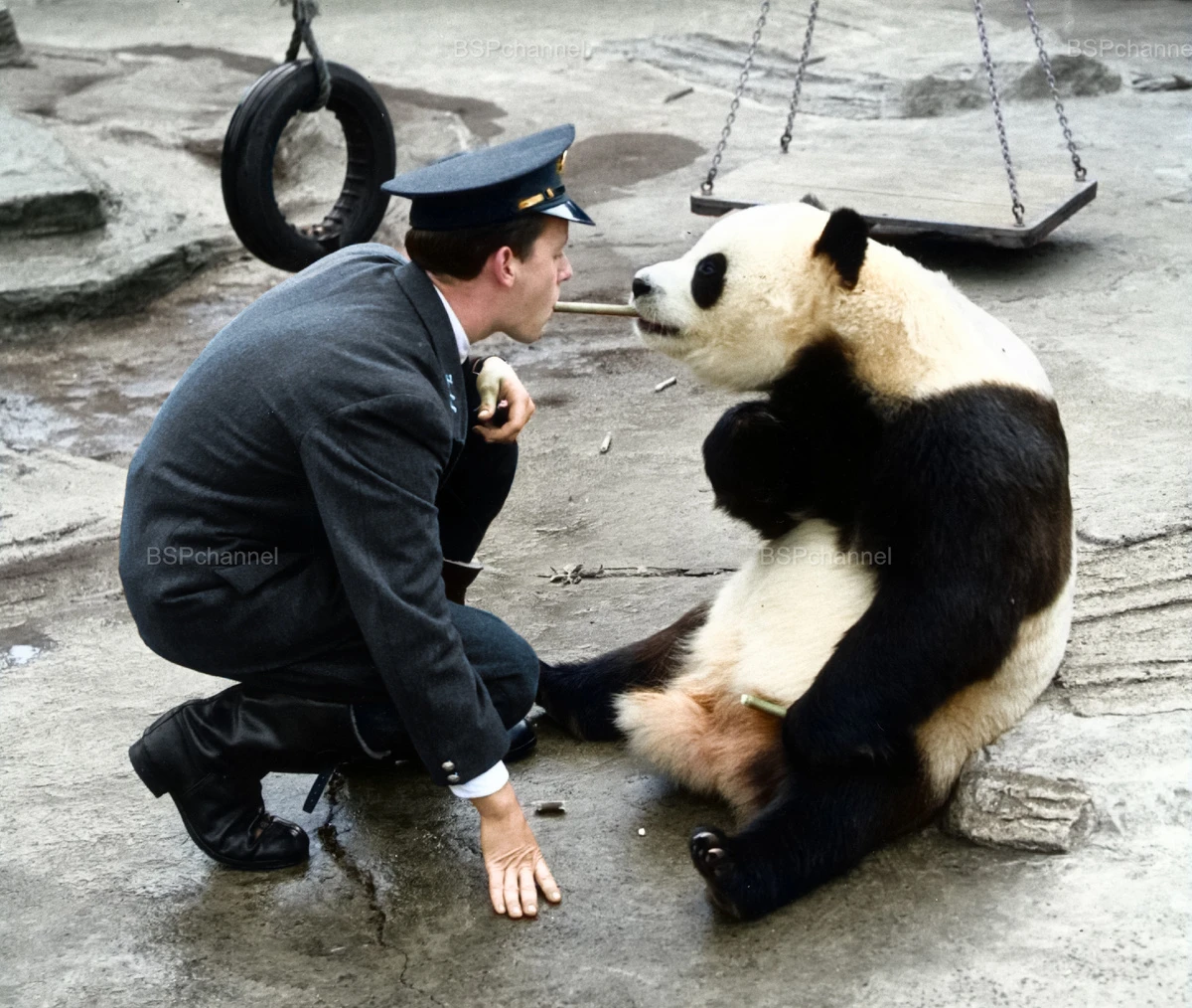 London Zoo keeper Alan Kent feeds panda Chi-Chi bamboo clenched between his teeth, 1959.