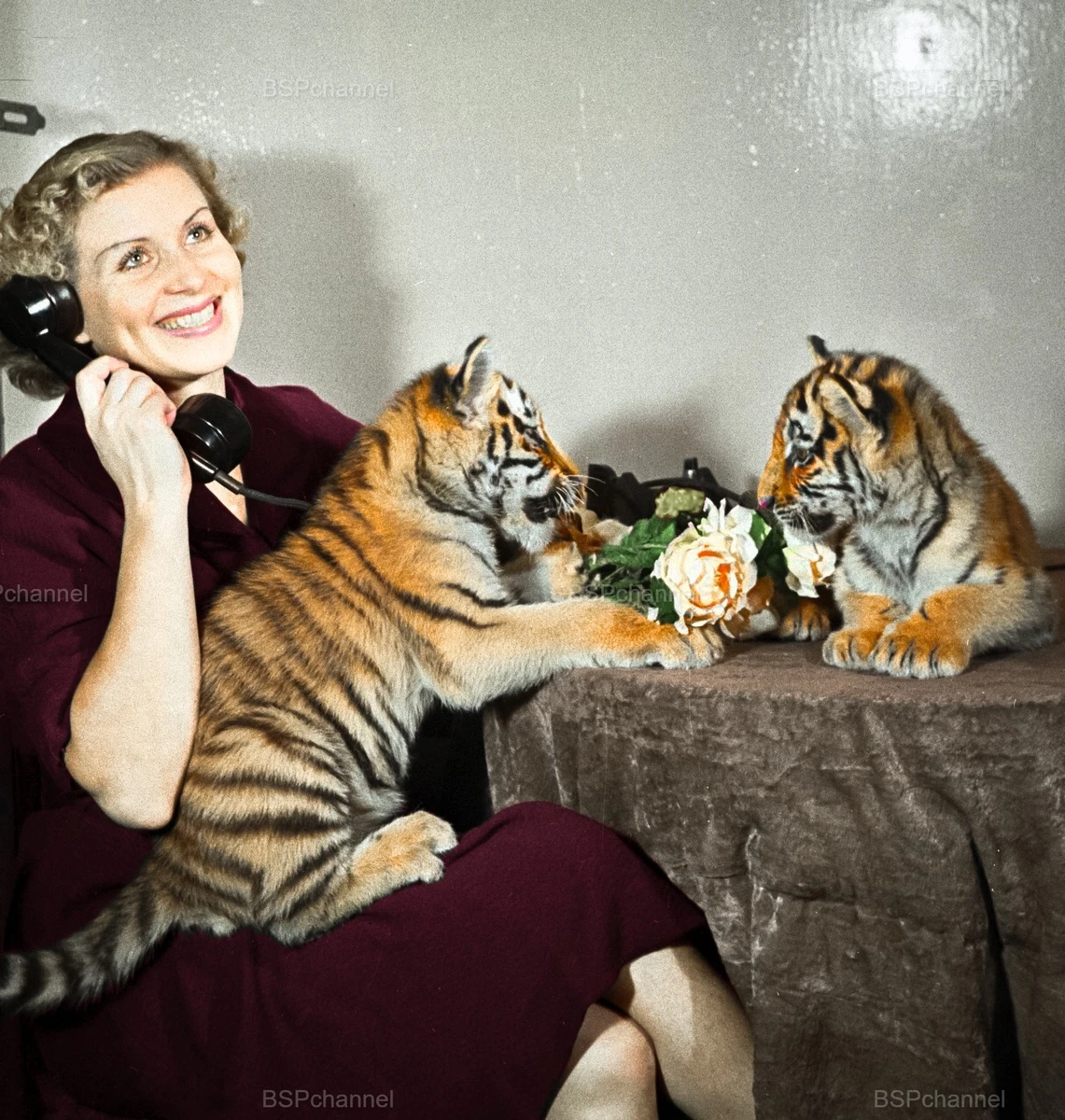 Soviet animal trainer, circus performer, and film actress Margarita Nazarova with tiger cubs, 1958.
