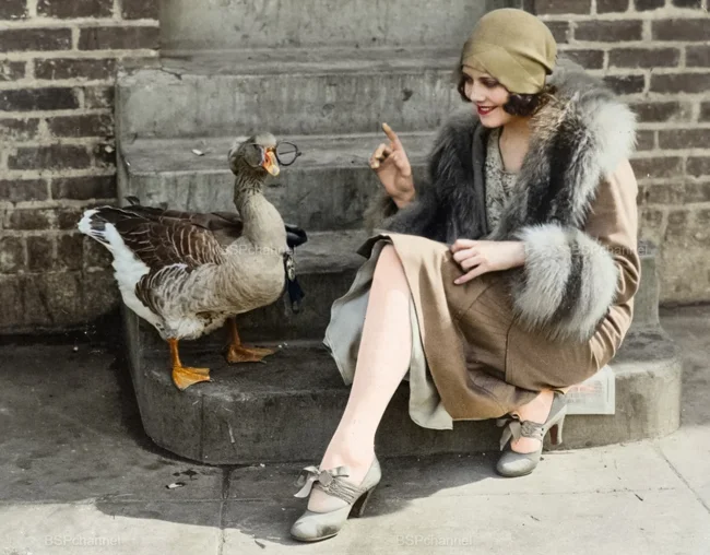 Film actress Fay Webb with her pet goose, which wears attractive glasses, 1925.