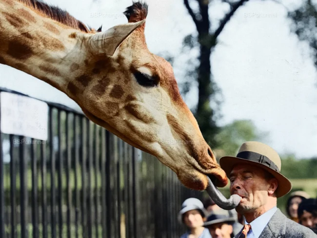 Captain Pfeiffer regularly visited London Zoo for many years and even managed to train a giraffe to gently take a biscuit straight from his lips. Giraffes have black tongues—a natural defense against sunburn. Giraffes spend a lot of time plucking leaves from tall trees, their favorite food. Their tongues are constantly exposed to the sun, especially in the hot savannas of Africa. The dark pigmentation of the tongue is due to increased melanin content, the same substance that protects the skin from ultraviolet radiation.