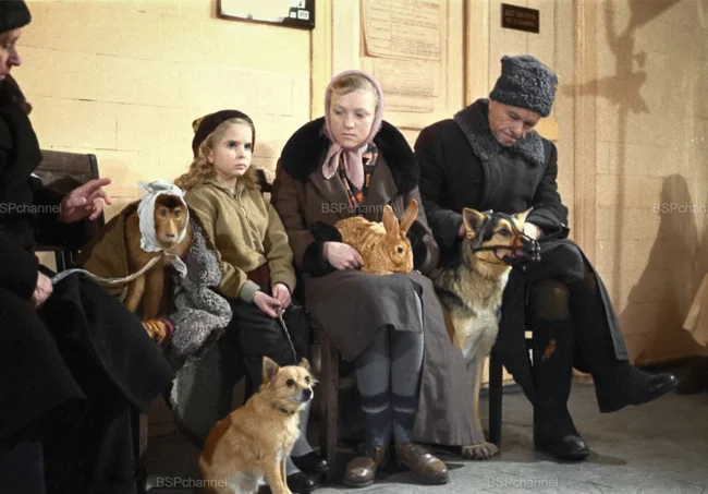Blue Cross Veterinary Hospital. Visitors with their pets await their appointment. Moscow, 1956.