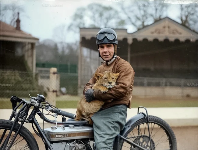 Motorcyclist Triss Sharp and his mascot, a lion cub, at the Crystal Palace in London, 1930.