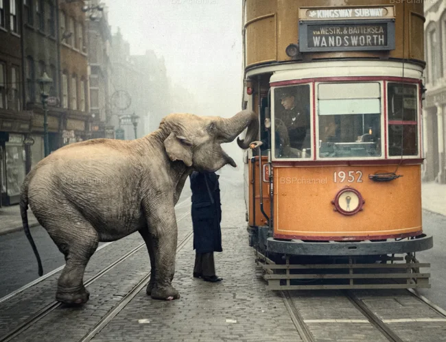 A female elephant named Mae West accepts an apple from a passing tram driver during her morning jog along Gray's Inn Road in London, 1956.