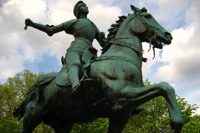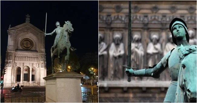 This statue by Paul Dubois from the late 19th century is one of the most famous images of the Maid of Orleans in Paris. The sword in her right hand was part of the composition, but it wasn't securely fastened. Now Joan is left with an empty hilt, the blade has been sent for analysis, and the man has been sent to a mental hospital for examination.