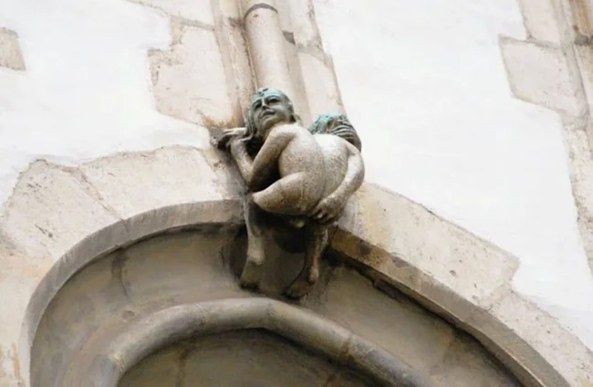 On the south window of the Church of St. James in Brno, Czech Republic, a strange figure is lost among the Gothic decoration: a two-faced figure, brazenly displaying his naked buttocks to the world. Legends link it to a church rivalry: the spire of St. James was ten meters taller than the neighboring cathedral, and this sculpture became the winner's last word. However, historians believe it is simply a bizarre decorative element, not unique to the Gothic style.