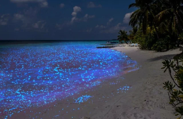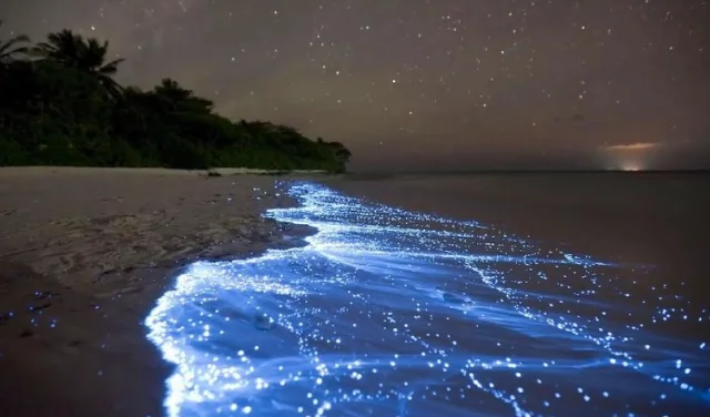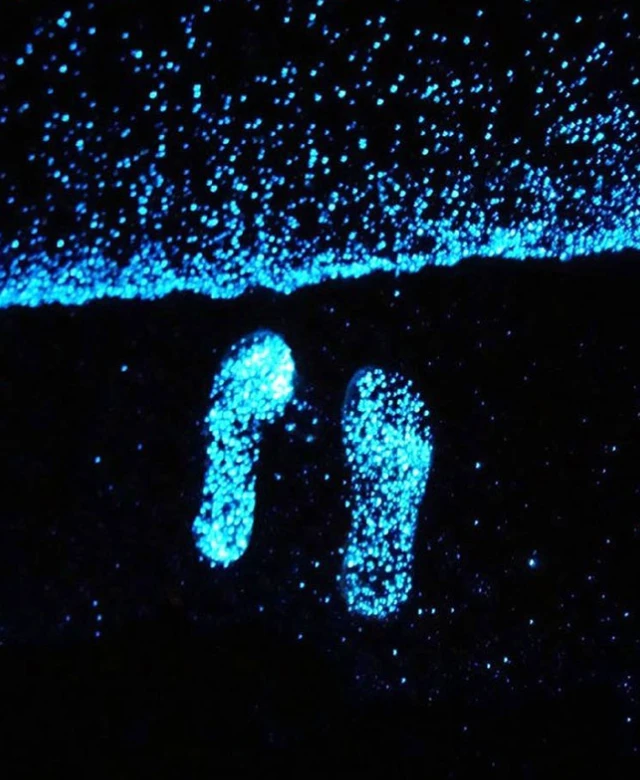 The glow is produced by phytoplankton—tiny floating organisms. Special chemical reactions occur within their cells, causing bioluminescence—a natural luminescent phenomenon. When the water is disturbed—whether by waves, a human touch, or a passing fish—the plankton flashes a bright neon light.