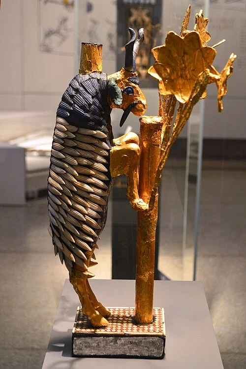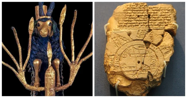 Dated to approximately 2500 BC. Found in the Royal Tombs of Ur (modern-day Iraq). Made of gold, copper, wood, and lapis lazuli.