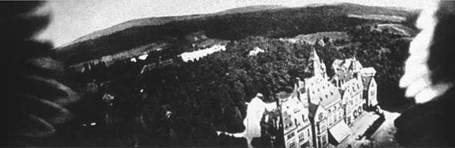 Aerial photograph of the Schlosshotel Kronberg, showing the wings of a pigeon