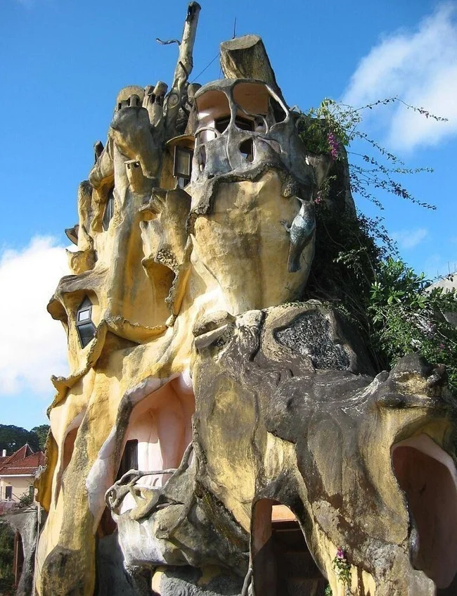 Hang Nga Guesthouse is located in Dalat, Vietnam. It resembles a huge tree, decorated with mushrooms, animal skins, caves, and a giant spider web.