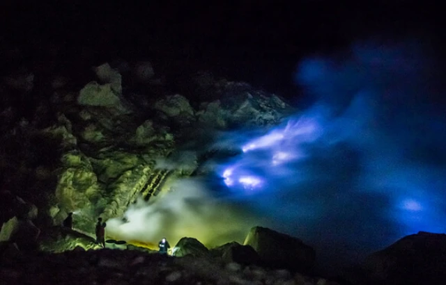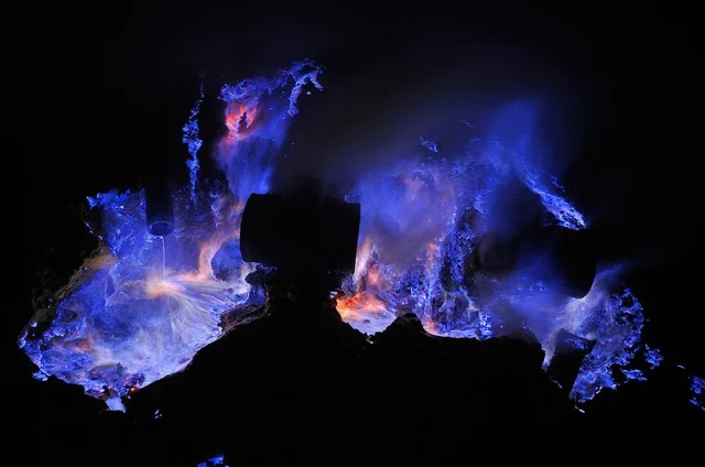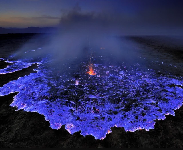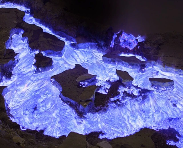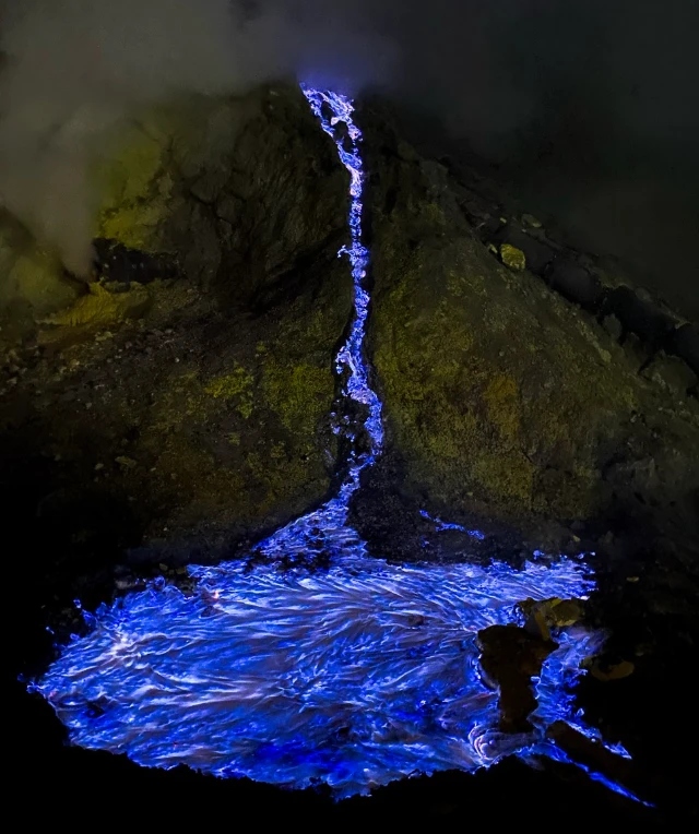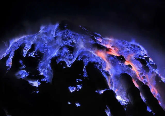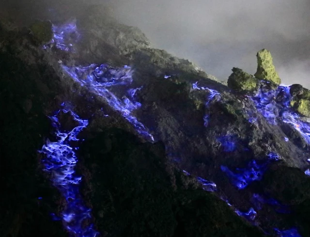 As darkness falls, Indonesia's Ijen volcano transforms into a natural lantern. Its slopes are pierced by streams of blinding blue-violet flame. This effect is the result of the instantaneous ignition of superheated sulfur gases upon contact with atmospheric oxygen.