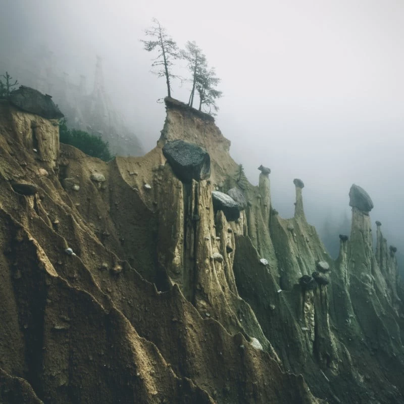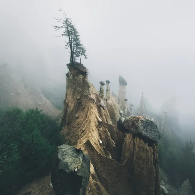 With the onset of the rainy season, water begins to erode these slopes, but if a rock gets in the way, the clay beneath remains untouched. Thus, while the rains mercilessly wash away the surrounding soil, majestic columns are born under the protection of the rocks. It takes nature hundreds, sometimes thousands, of years to create one such pyramid.