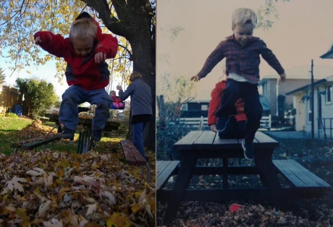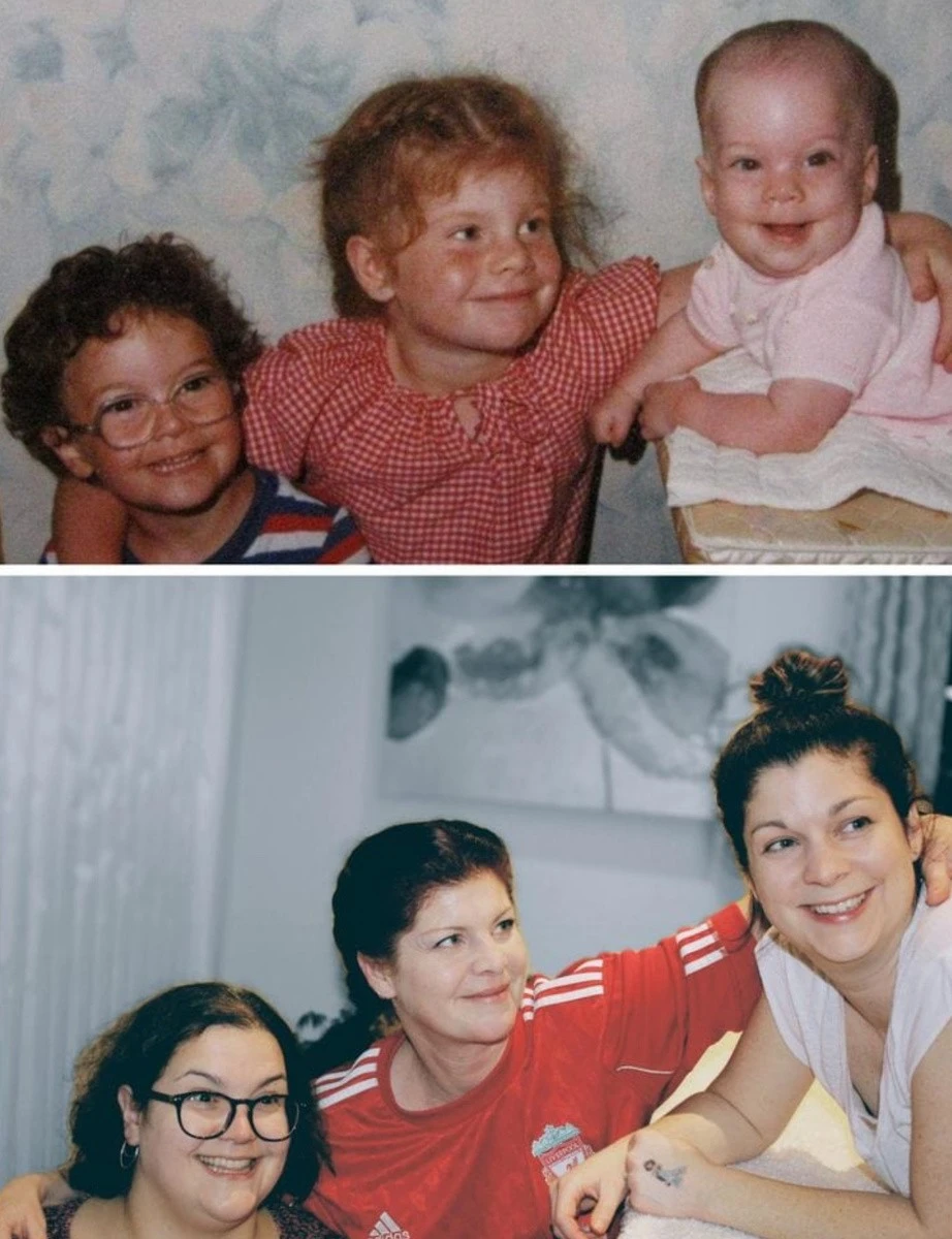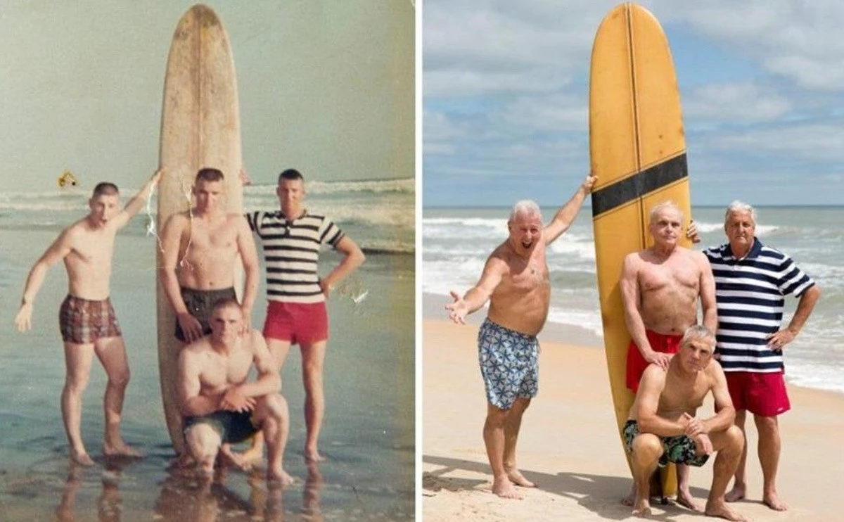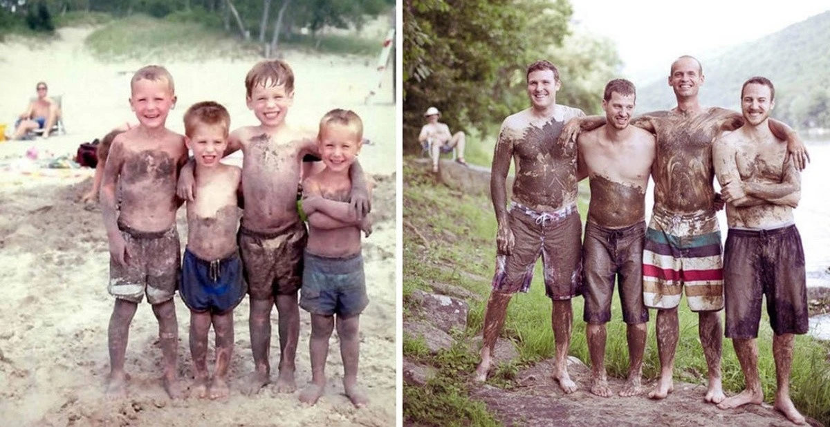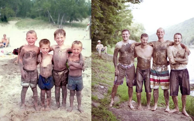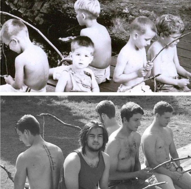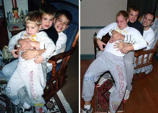 For example, you could recreate photos from your personal archive, only in the present day. All you need to do is gather everyone present in the photographs, recreate the former setting, and capture it all on camera. Then, taking two photos (from that time and the one taken now) and comparing them is incredibly cool, believe me. Here are 18 examples of people who have brought this idea to life. Enjoy the results!