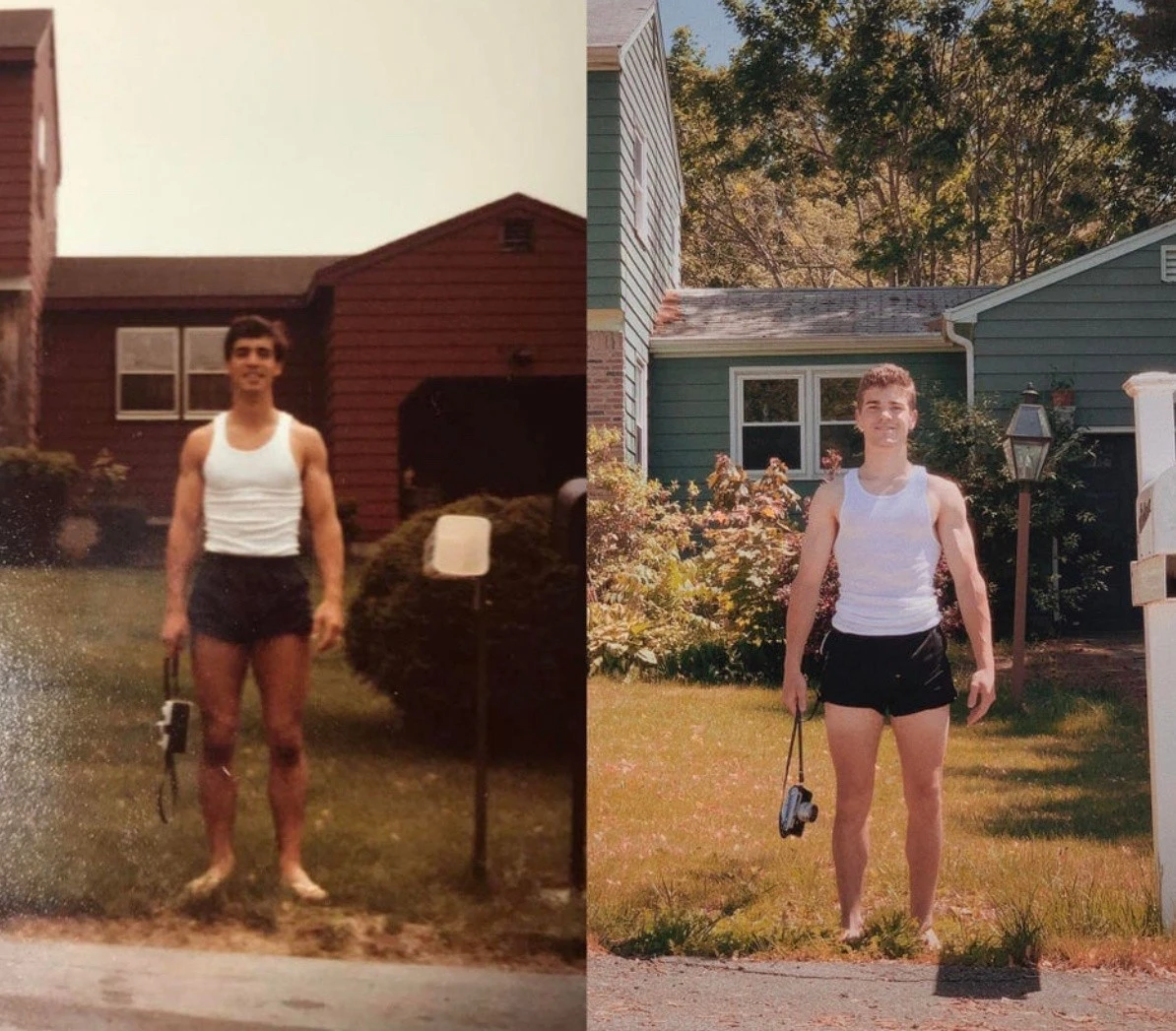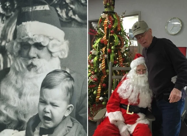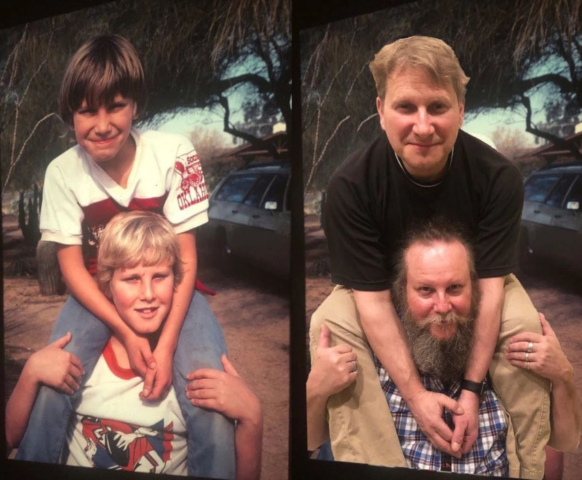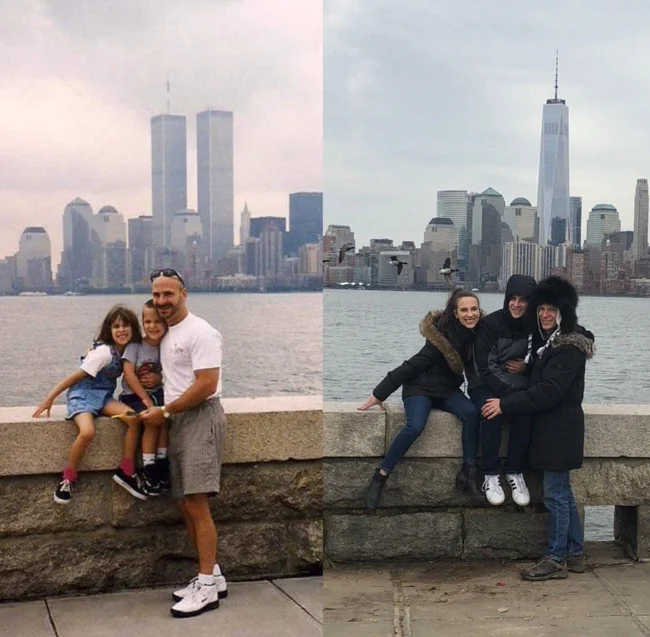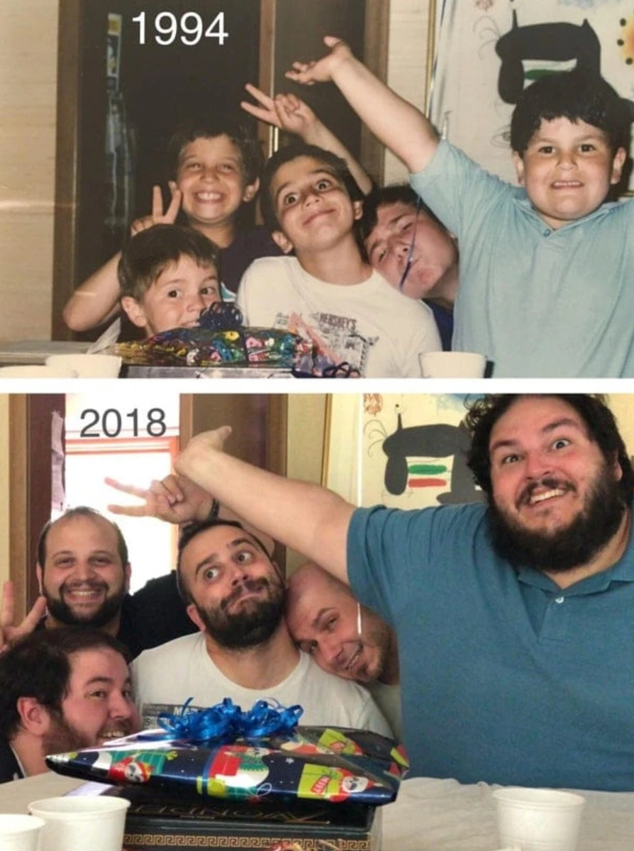 For example, you could recreate photos from your personal archive, only in the present day. All you need to do is gather everyone present in the photographs, recreate the former setting, and capture it all on camera. Then, taking two photos (from that time and the one taken now) and comparing them is incredibly cool, believe me. Here are 18 examples of people who have brought this idea to life. Enjoy the results!