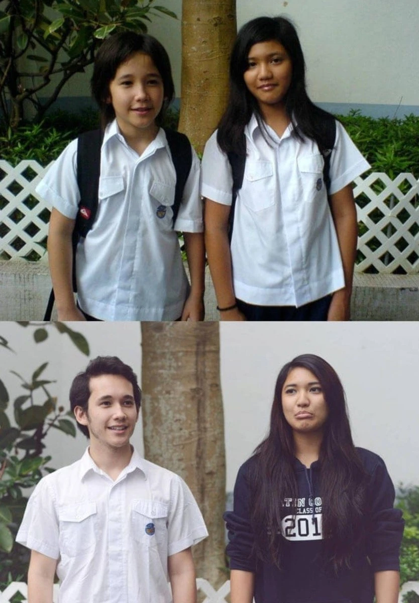 In the first photo, we just started school; in the second, we're already finishing school.