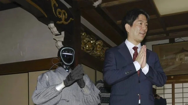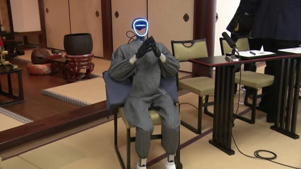 Japanese scientists from Kyoto University unveiled Buddharoid, a humanoid robot trained in Buddhist scriptures. Standing almost 130 centimeters tall, the device, dressed in gray robes and temporarily faceless, can walk, make the gassho gesture (pressing one's palms in prayer), and answer questions about life, suffering, and liberation.