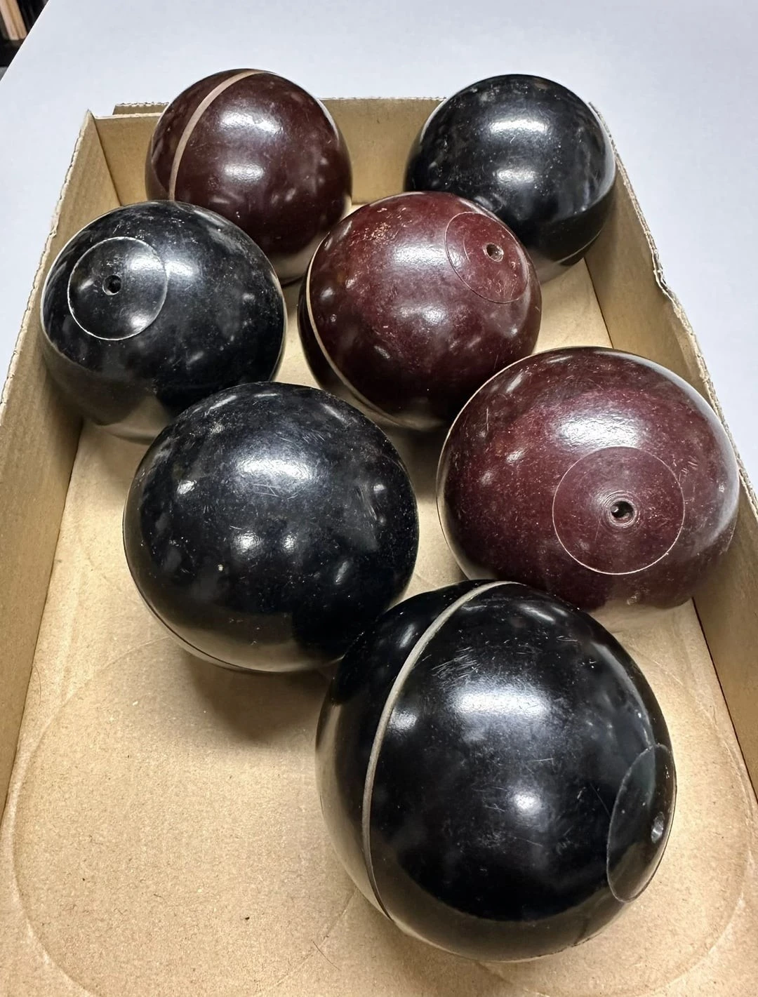 1. Black and brown spheres with holes, found at a flea market.