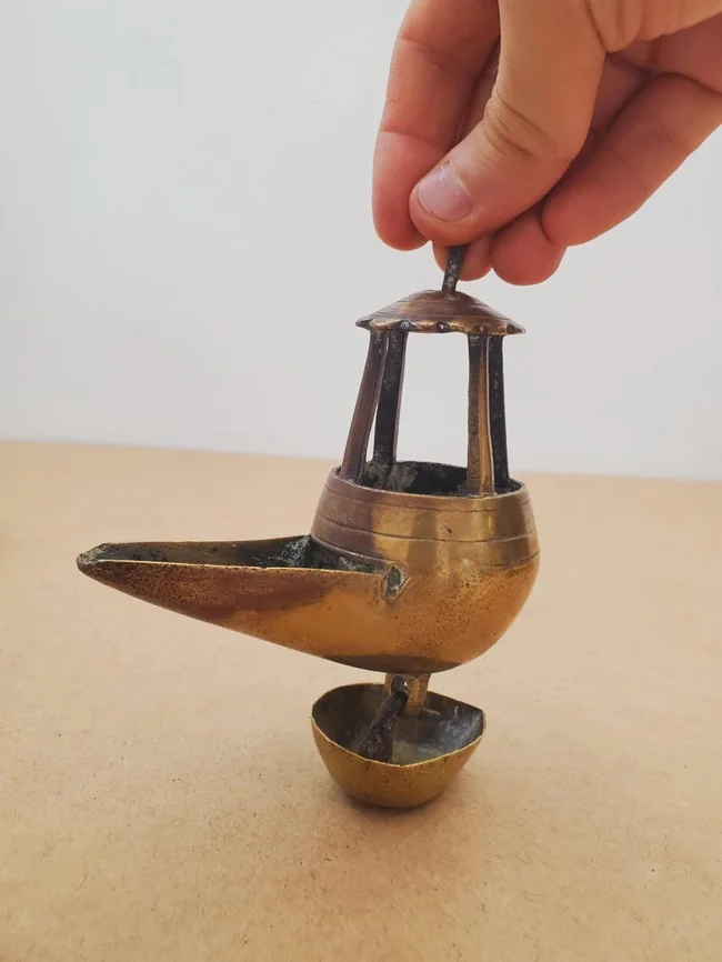 8. Brass oil lamp with multiple spouts and a grille on top