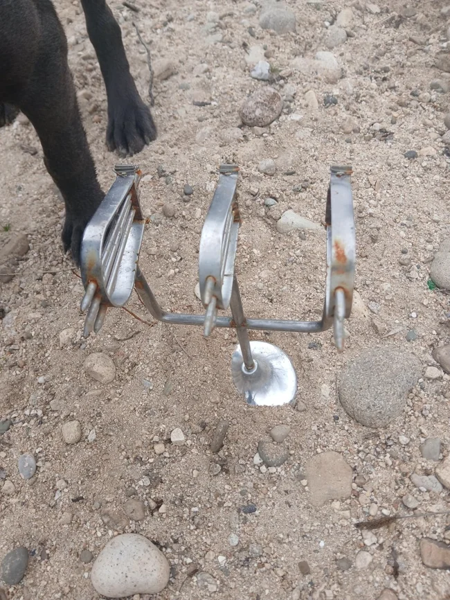 2. A small metal object found near a river. It has three prongs, each with three spikes.