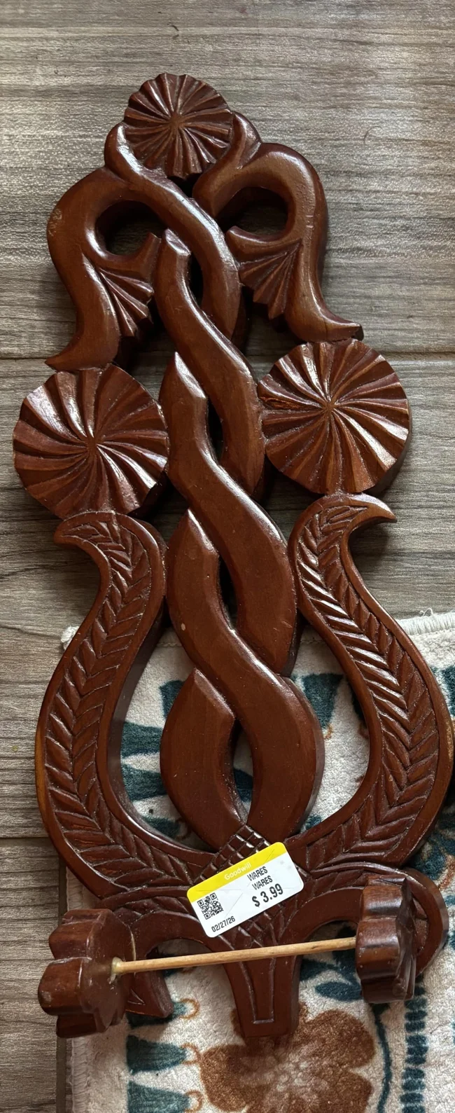 9. A carved wooden object, suitable for wall hanging, with a crossbar at the bottom.