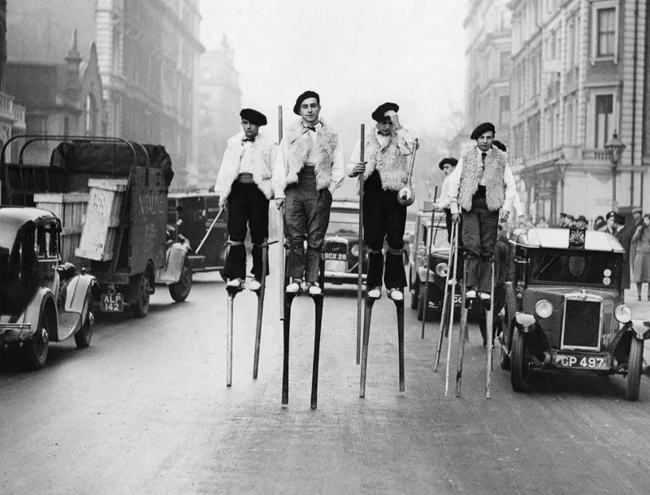 Stilt dancers from the Landes region walk through London to a performance at the Royal Albert Hall. 1937