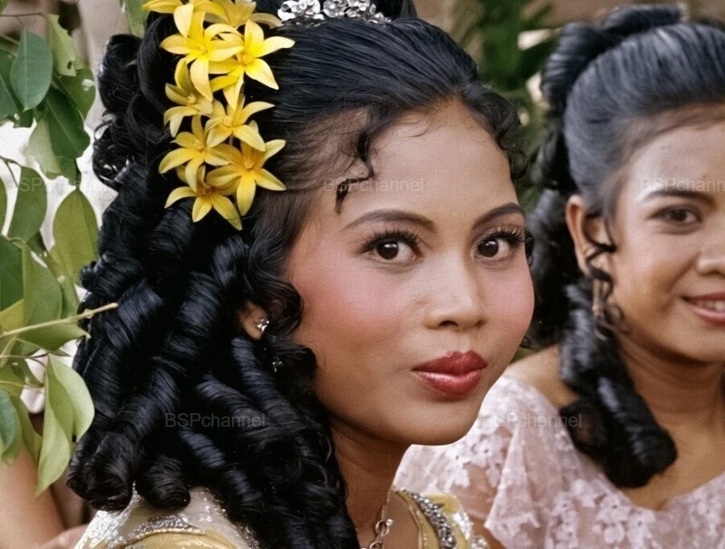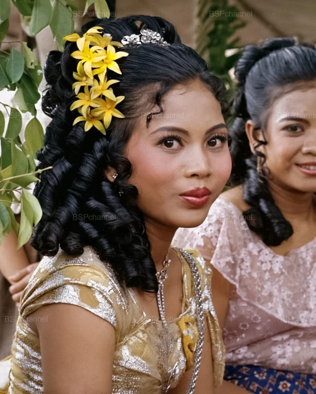 A bride getting dressed for her wedding. Phnom Penh, Cambodia, 1988.