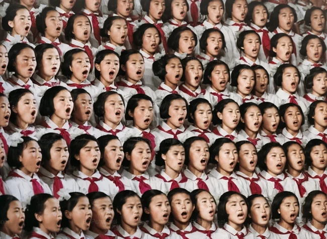 North Korean girls sing a song about Kim Il Sung, 1950.