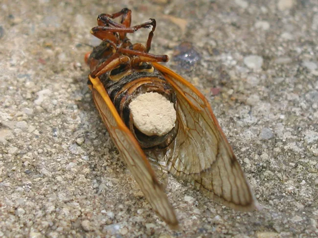 All normal Cordyceps grow fruiting bodies outside the host's body. But cicada Cordyceps grows spores directly within the insect's abdomen. At some point, the abdomen falls off, and thousands of spores spill out.