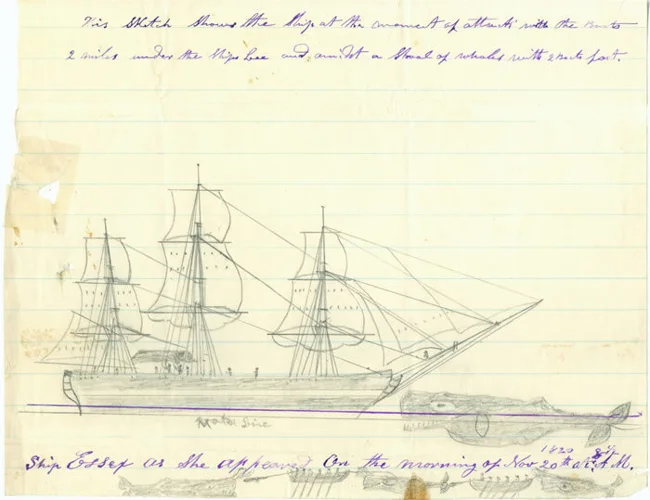 This much simpler, more schematic drawing has no artistic merit, but it is far more accurate: a sperm whale attacked the ship right in the bow. It was also drawn by Thomas Nickerson, a cabin boy who served on the Essex.