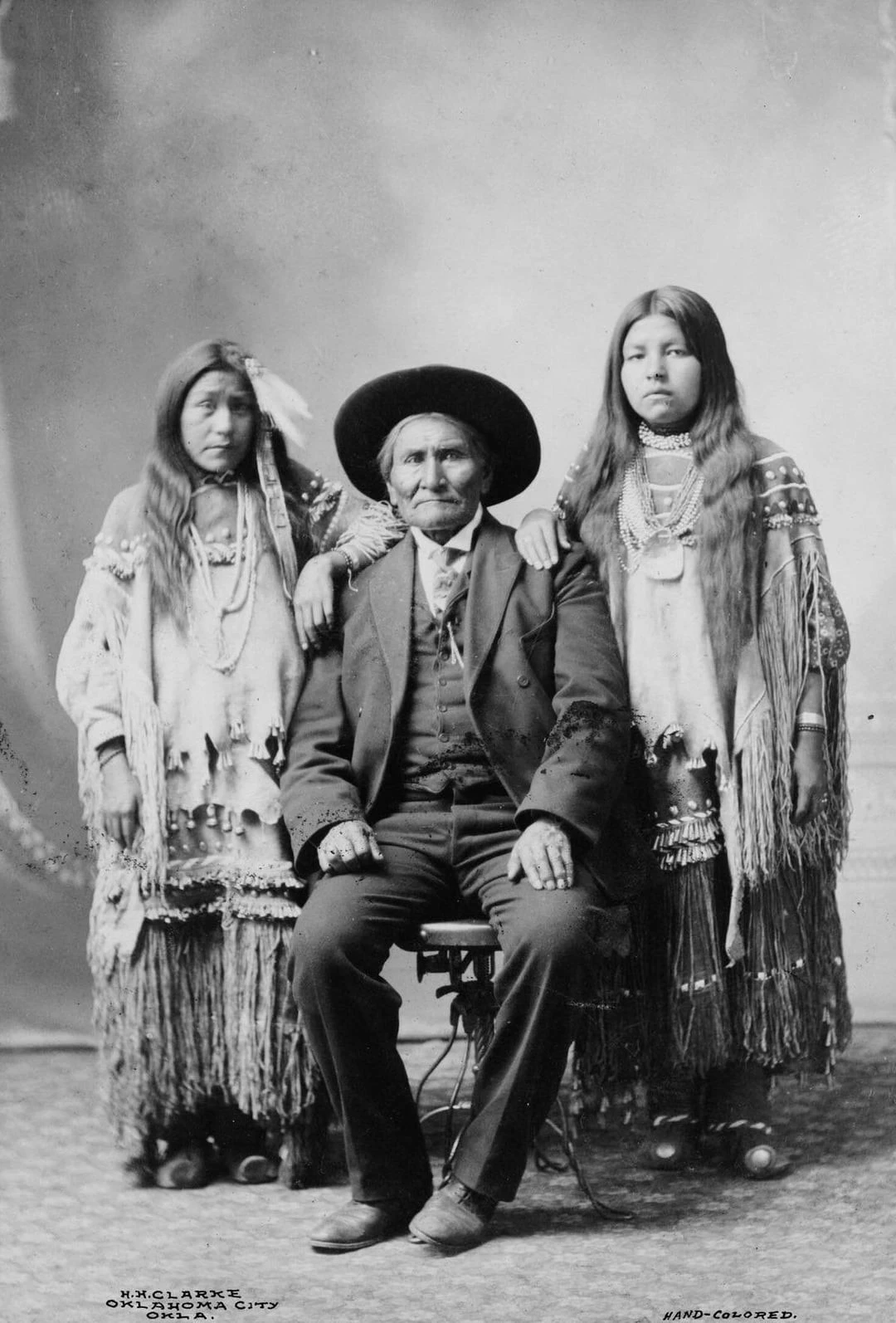 11. Apache Chief Geronimo and his two nieces, 1900. Oklahoma City, Oklahoma